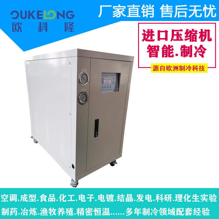 歐科隆制冷水冷箱式冷水機組詳細特點介紹.制冷心臟采用全密封低噪音,振動小,采用高效能省電國際著名名牌壓縮機(美國谷輪牌,日本三洋,日本大金,法國美優(yōu)樂等),電器控制全部采用進口名牌原件,熱交換器采用殼管式冷凝器,換熱效能高,便于清洗保養(yǎng)。