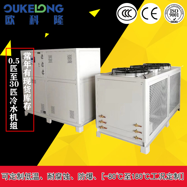 歐科隆牌風冷式冷水機之制冷心臟采用全密封低噪音,振動小,高效能省電進口名牌壓縮機,電器控制全部采用進口名牌原件,熱交換器采用殼管式冷凝器,換熱效能高,便于清洗保養。